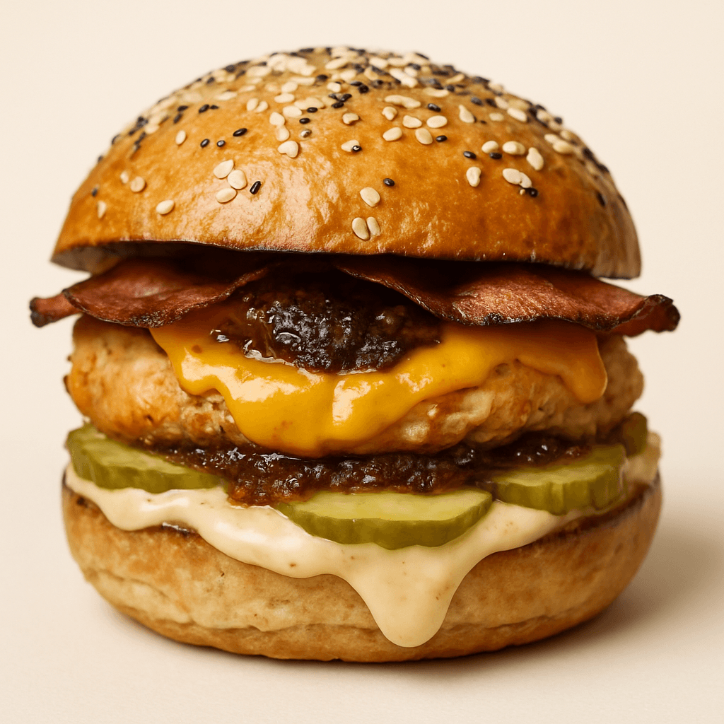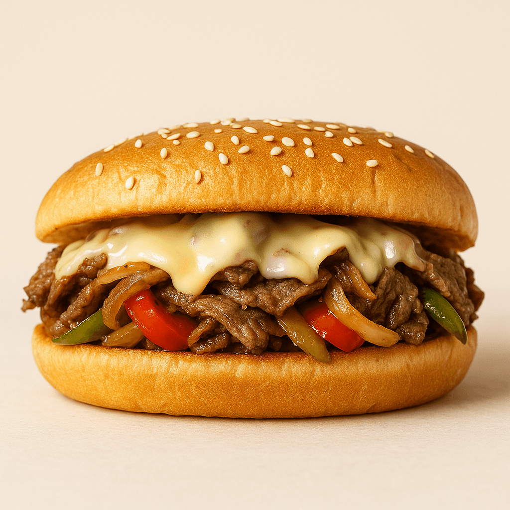 Grilled steak on a toasted bun, topped with your choice of ingredients. Served with + drink.