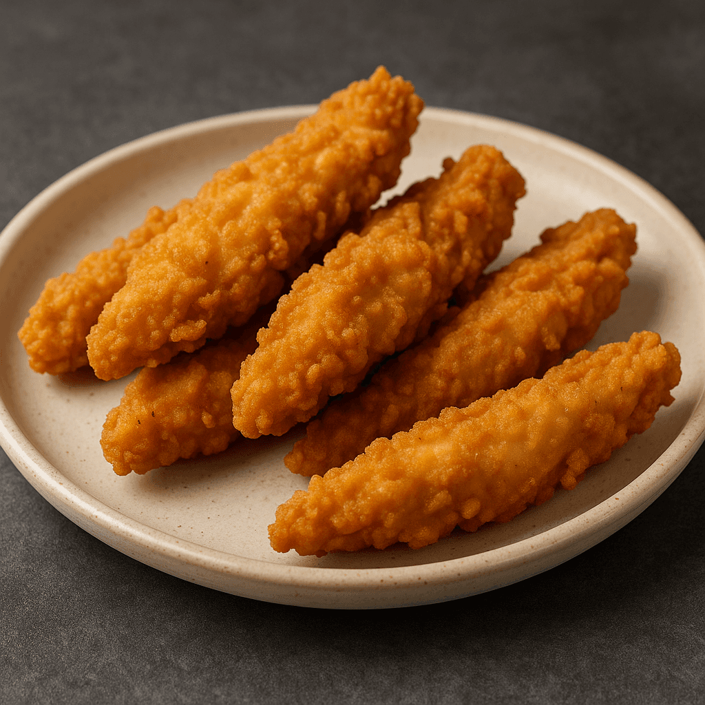 Crispy chicken strips served with fries, dipping sauce, and a drink