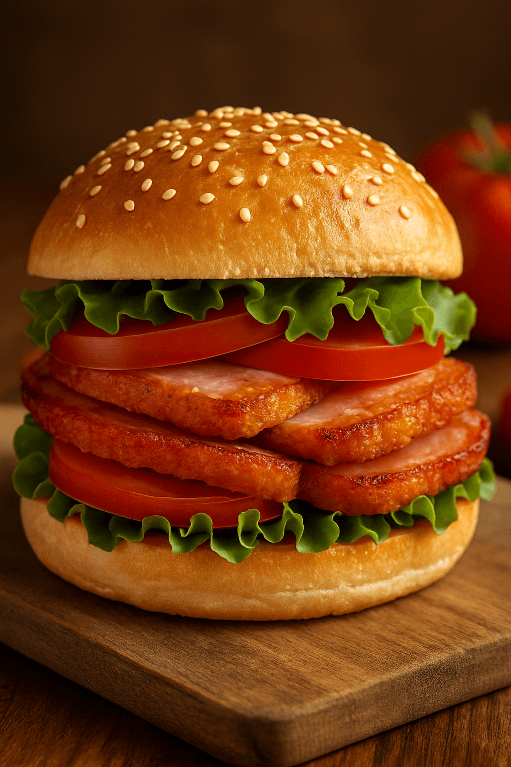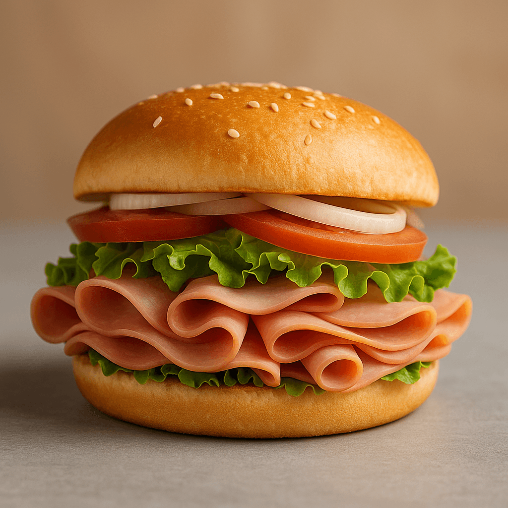 Tender sliced ham on a toasted bun with fresh lettuce and tomato. Served with a drink